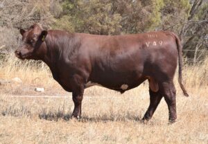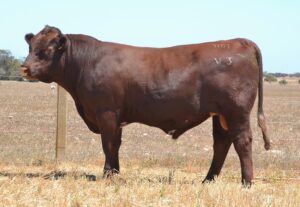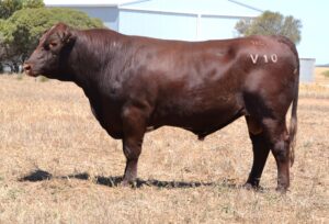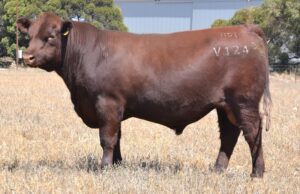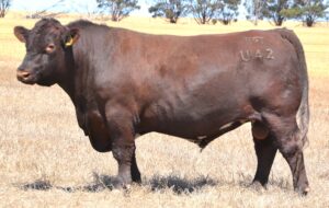 Thick set, red bull with an extra degree of muscle expression and a wide topline. High growth data. Above average marbling and EMA. Dam has bred bulls selling to $17,000. 40kg Birth.