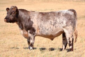 A silver roan bull with shape and style. Average birth, above average growth, fat, and high docility data. 44kg Birth. HOMOZYGOUS POLLED