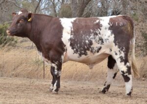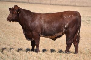 Slick coated, red bull with a lot of carcass shape. High growth and maternal calving ease data as well as high marbling. Top 20% API. Maternal brother sold for $13,000. These 2 are the last of the Sprys Unlimited bulls we will offer who bred selling to $18,000. 37kg Birth.