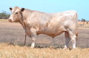 A white bull with an early-mid maturity pattern and a wide hindquarter. Dam is a 2yr old first calving heifer. Low birth and calving ease data with high stayability, and above average fat and marbling. Top 10% API. 30kg Birth. HOMOZYGOUS POLLED