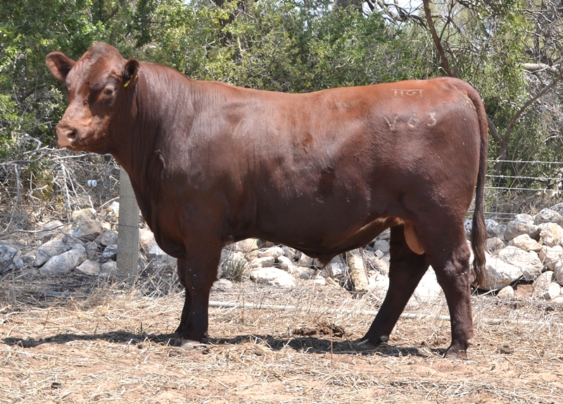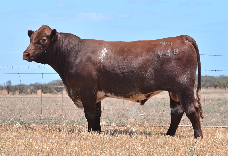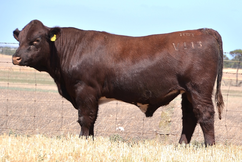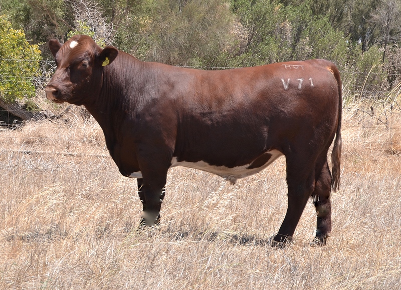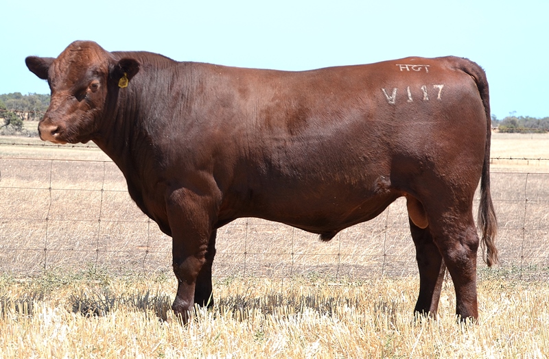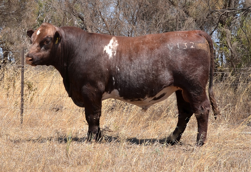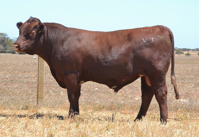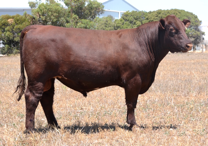 Thick set, red bull with an extra degree of muscle expression and a wide topline. High growth data. Above average marbling and EMA. Dam has bred bulls selling to $17,000. 40kg Birth.