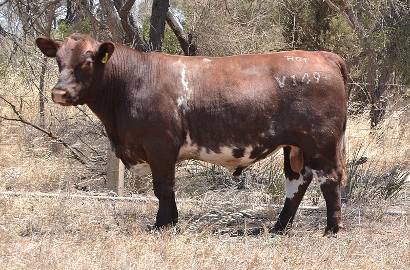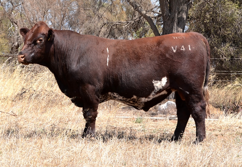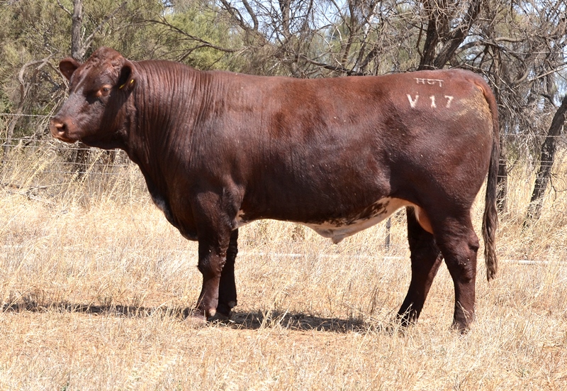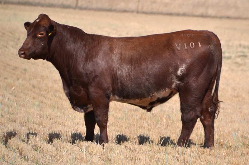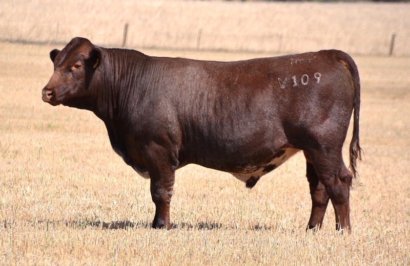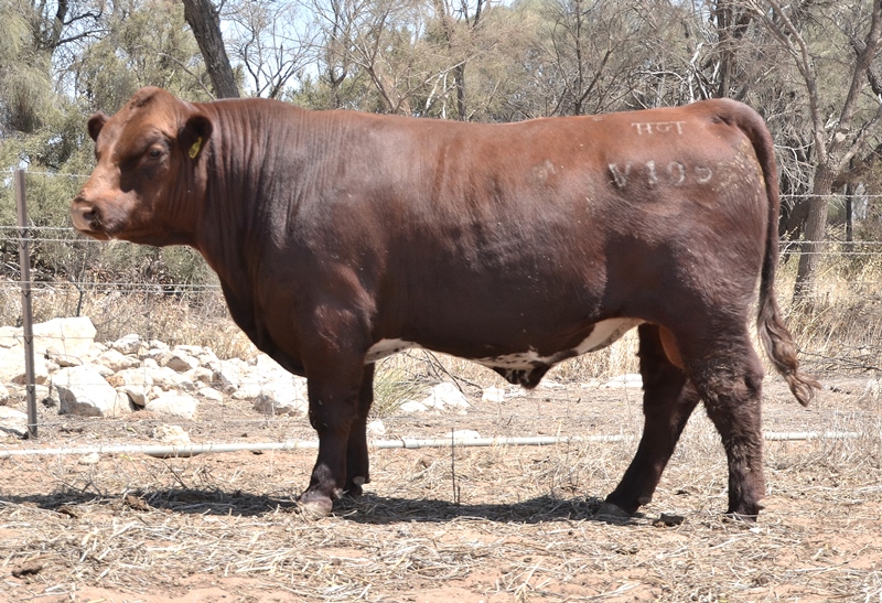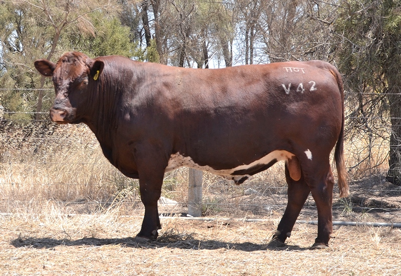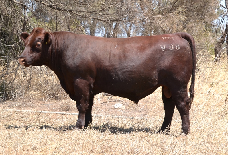 Thick set, red bull with an extra degree of muscle expression and a wide topline. High growth data. Above average marbling and EMA. Dam has bred bulls selling to $17,000. 40kg Birth.