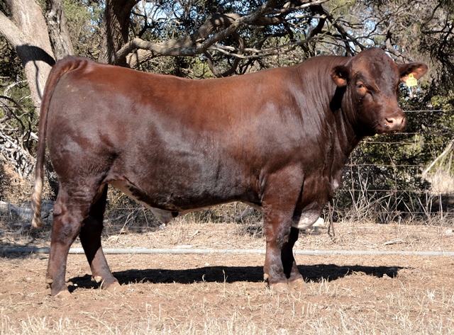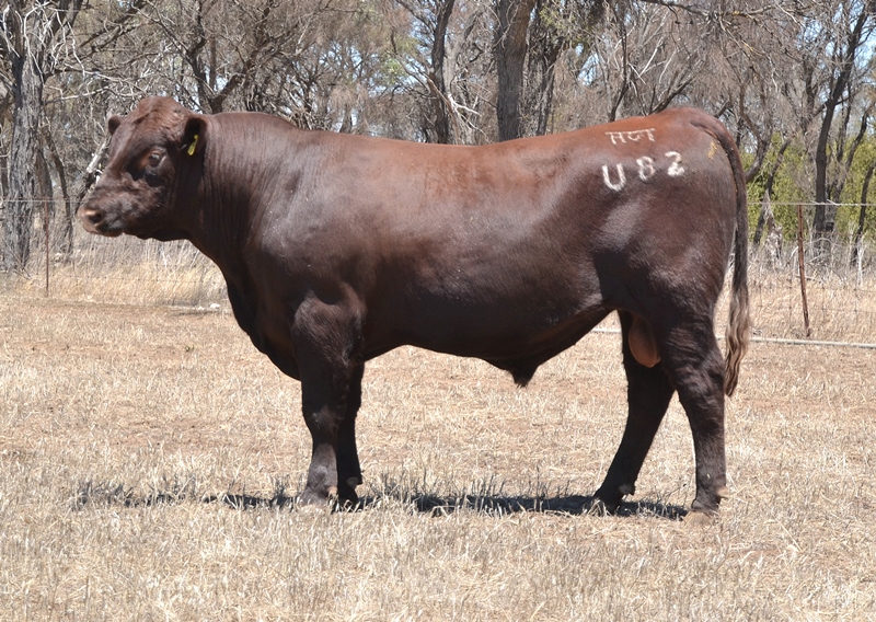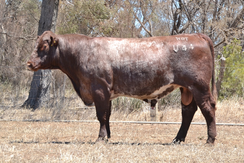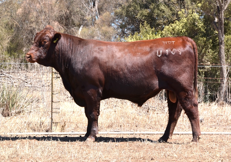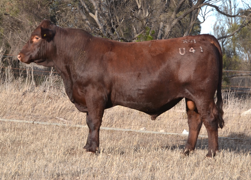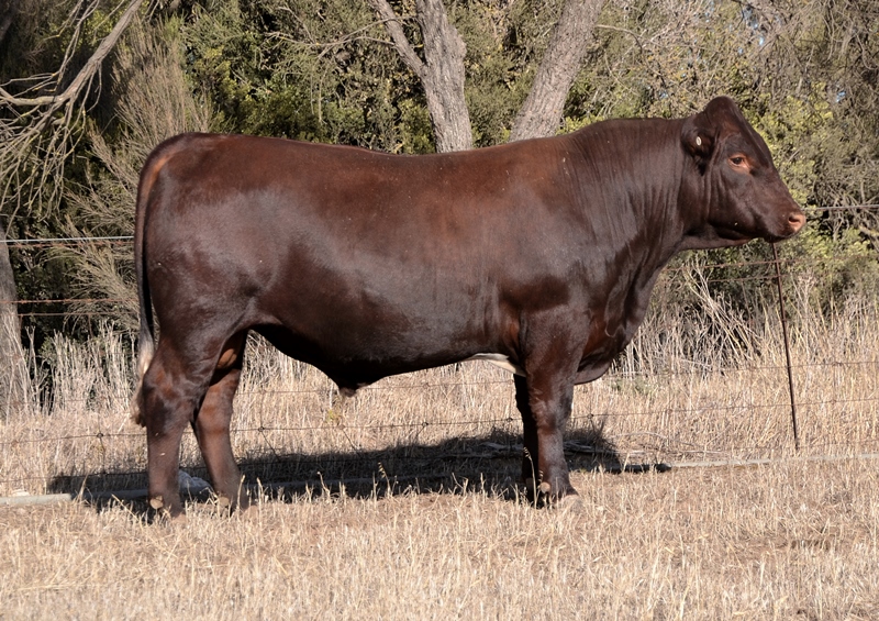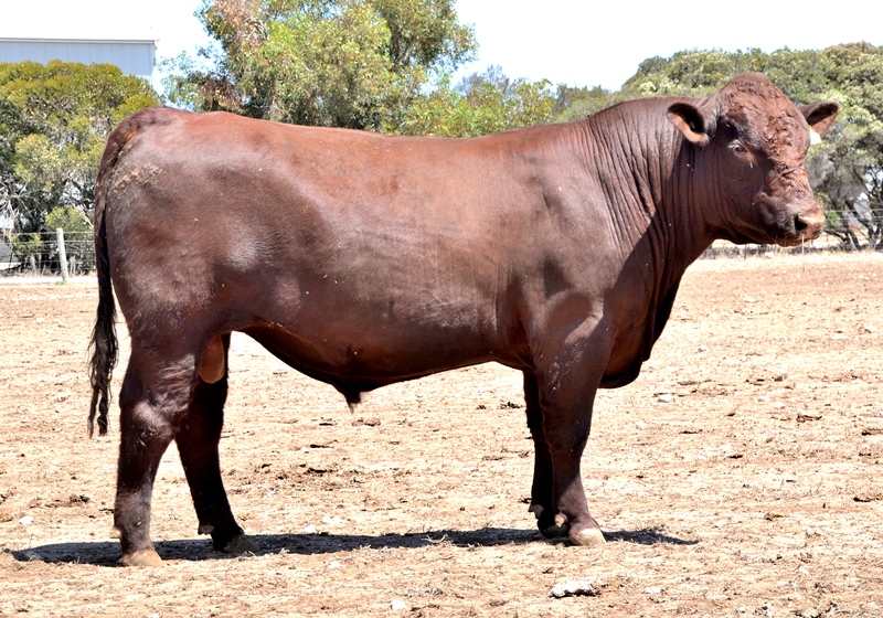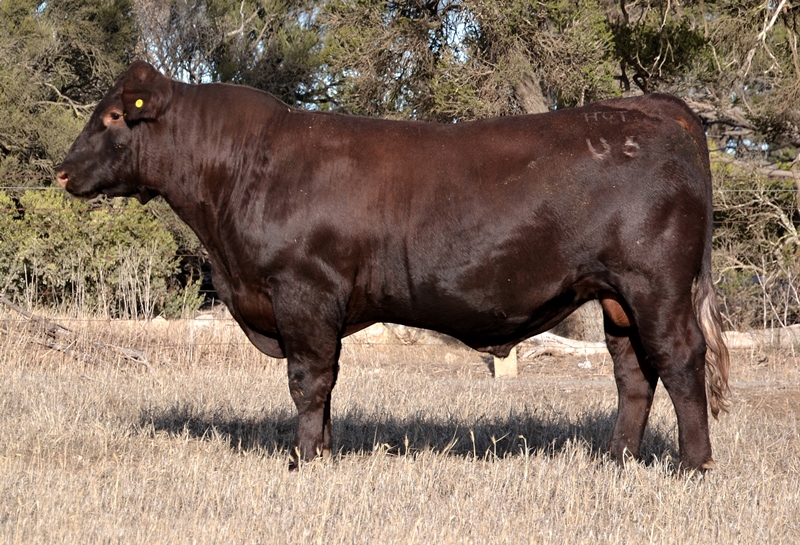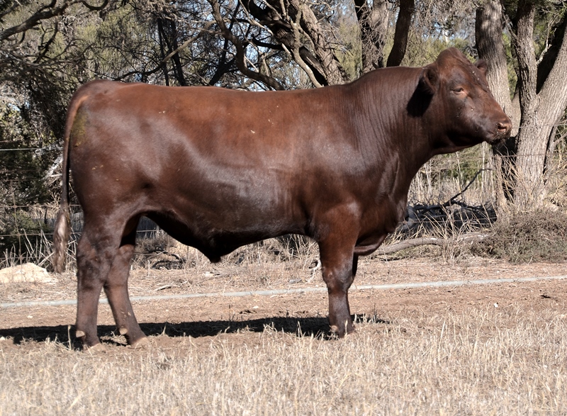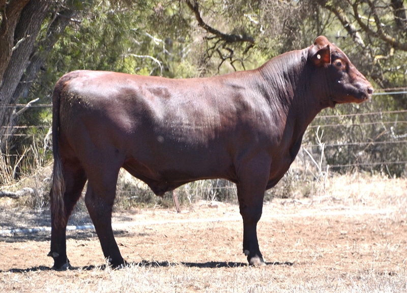 A dark red bull with a lovely muscle expression. Top 15% Docility, 20% Weaning Wt, Carcase Wt, Top 30% Stayability. First Bungulla Lyndon son we have offered. 36kg born.
