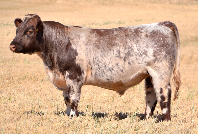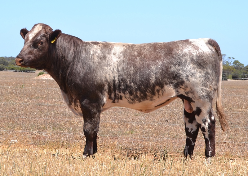 A low birth weight, early maturing, roan bull with a very good data set. High marbling, fat, docility, milk and stayability, combining for Top 1% API. 33kg Birth.