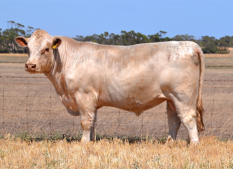 A white bull with an early-mid maturity pattern and a wide hindquarter. Dam is a 2yr old first calving heifer. Low birth and calving ease data with high stayability, and above average fat and marbling. Top 10% API. 30kg Birth. HOMOZYGOUS POLLED