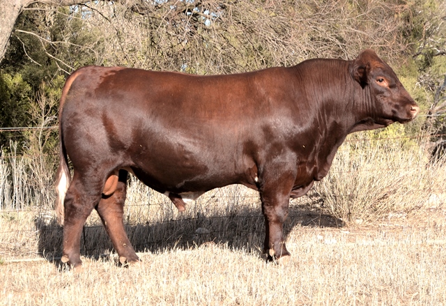 A lovely slick coated, dark red bull with above average growth, marbling and fat data. Top 25% EMA, Fat, Stayability, Top 30% Carcase Wt, Weaning Wt. 42kg born.
