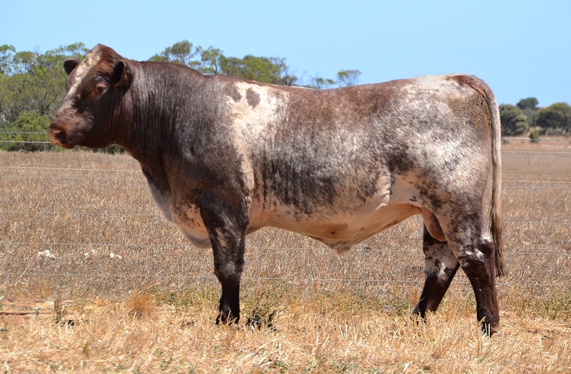 A mid maturing, long roan bull with a wide topline. Below average birth weight, maternal calving ease, high growth, EMA, fat and marbling data, culminating in Top 20% API. 35kg Birth. HOMOZYGOUS POLLED