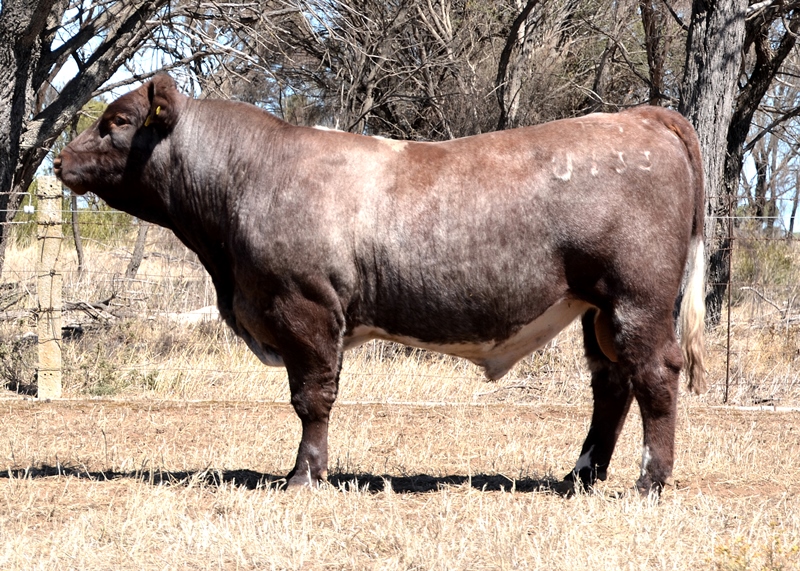 An early maturing bull with a big topline and muscle expression, combining low birth, high growth and fat data. Top 10% Maternal Calving Ease, Top 20% Fat and Carcase Wt, Top 25% Birth Wt. Maternal brothers have sold for $26,000 and $25,000. 40kg born. HOMOZYGOUS POLLED